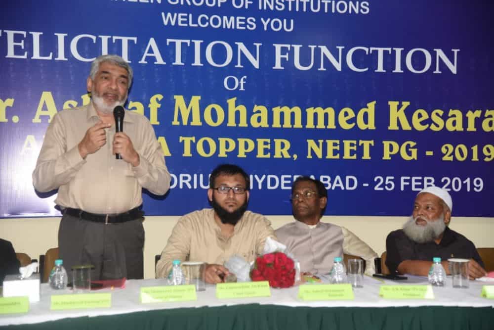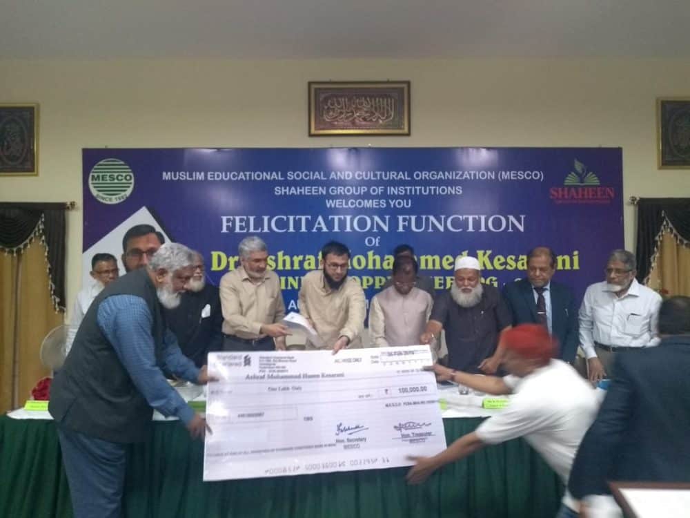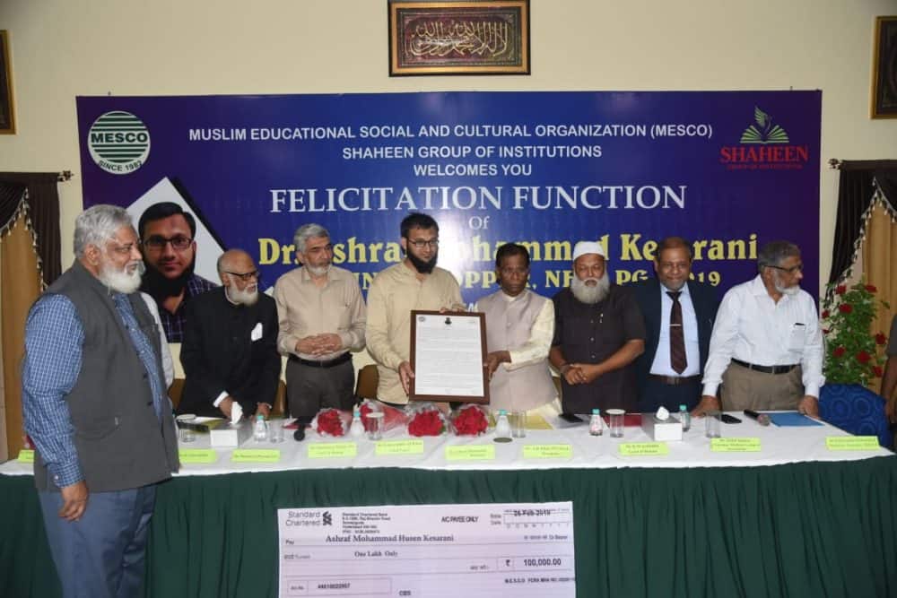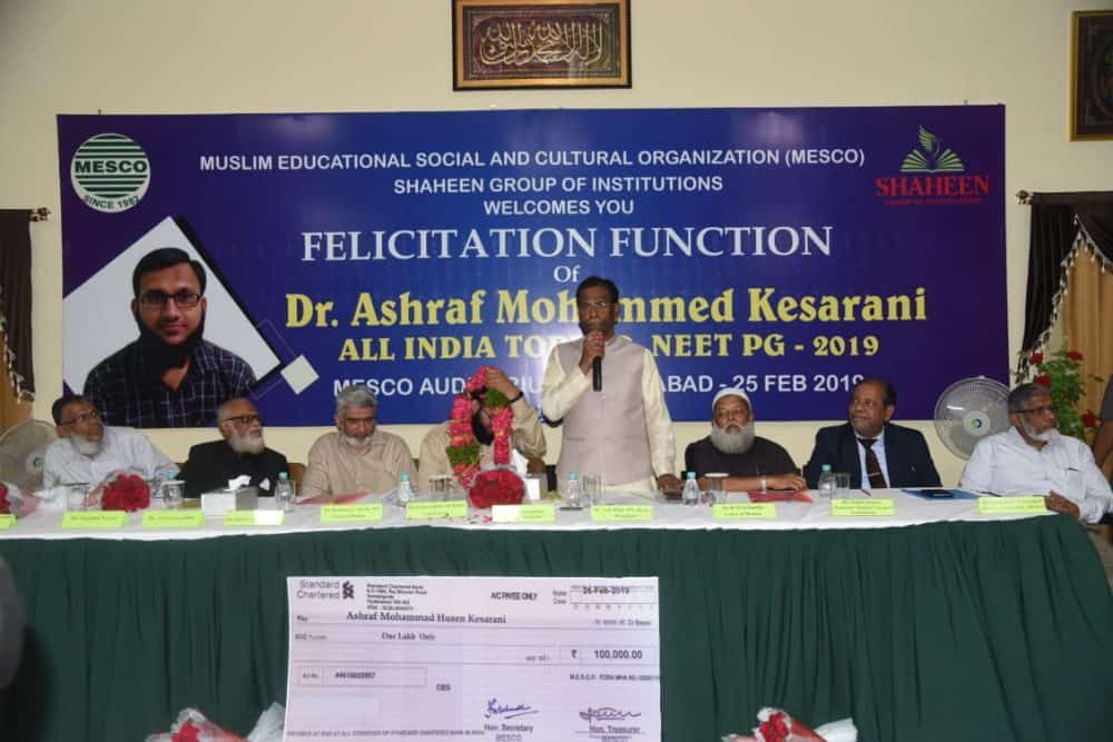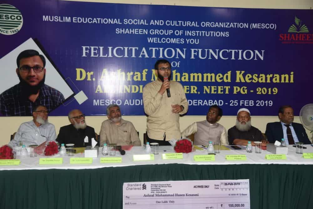 Hyderabad: Muslim Educational Social and Cultural Organization (MESCO) and Shaheen Group of Institution organized a felicitation function to honor Dr. Ashraf Mohammed Husen Kesrani, All India NEET PG-2019 topper.