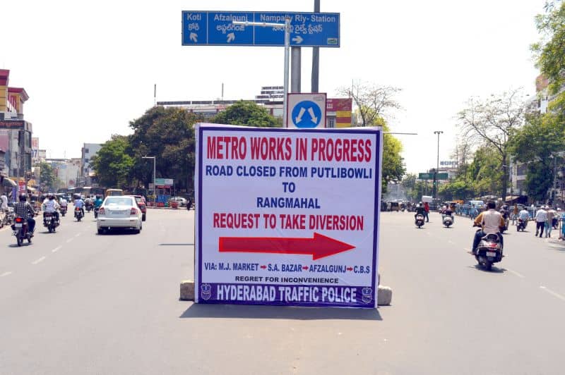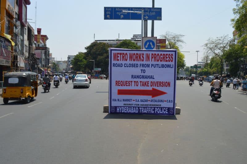 As the ongoing Meto Rail project in Koti-Sultan Bazaar area reaching its peak, the police official are diverting the traffic towards Moazam Jahi Market in Hyderabad on Friday. (Pics. Murli)