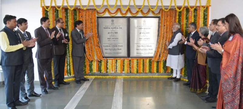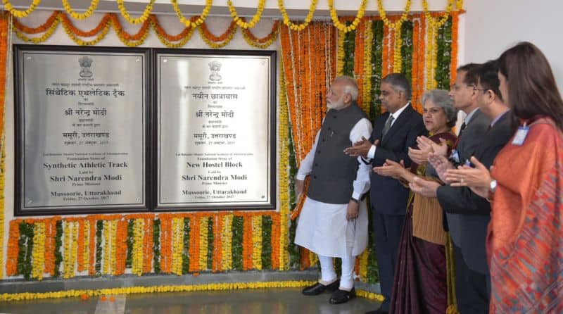 Mussoorie Oct 28: Prime Minister Narendra Modi unveiled the plaque to mark the laying of Foundation Stone of the New Hostel Building, and synthetic athletic track, at the Lal Bahadur Shastri National Academy of Administration (LBSNAA), in Mussoorie, on Friday. UNI