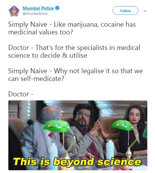 Taking a jibe at those who support legalisation of drug use, Mumbai police posted a meme using a still from Rajnikanth’s ‘Robot’.