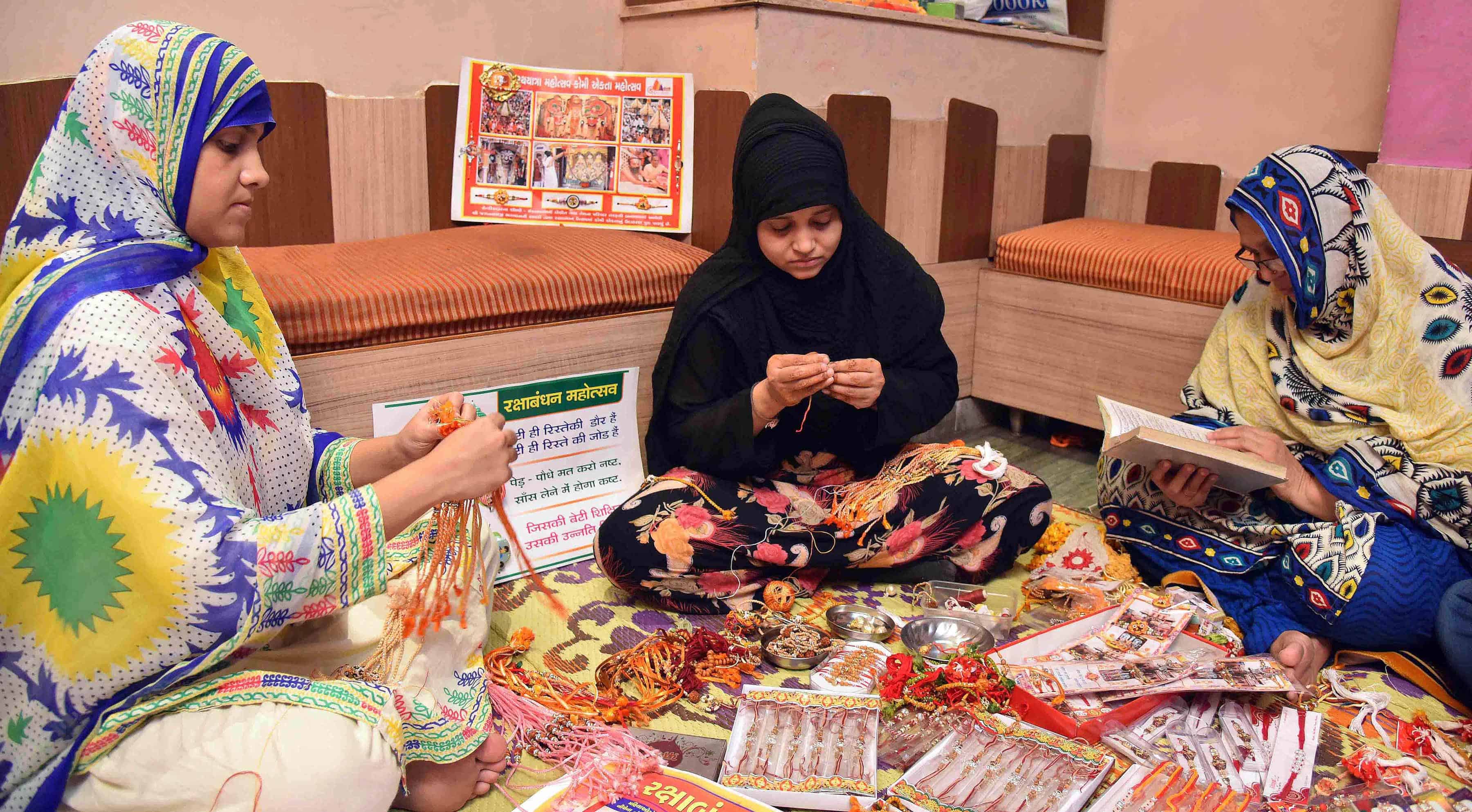 Muslim women making Rakhis ahead of Rakshabandhan festival in Ahmedabad on Wdednesday. UNI PHOTO- UNI PHOTO