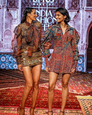 Nidhi Yasha’s label ‘Take me to the water’ included silhouettes inspired by the fluidity of water. The collection comprised free-flowing, printed multi-colour maxi dresses with ruffles and frills, glittery tasseled gowns, skirts and off-shoulder tops with balloon sleeves in colours like silver, pink, black and gold.