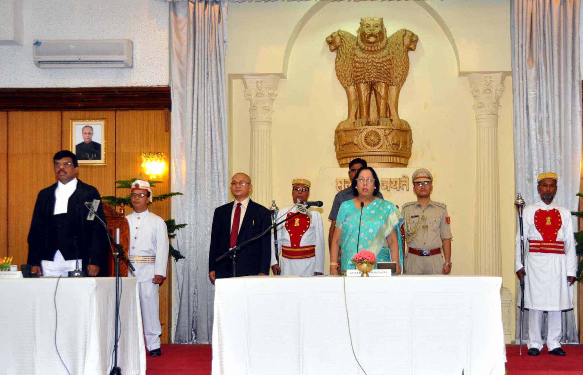 IMPHAL, AUG 21 (UNI):- Manipur High Court Acting Chief Justice, Rakesh Ranjan Prasad administered the oath of office and secrecy to Najma A Heptulla as 18th Manipur Governor, at Raj Bhavan, Darbar Hall in Imphal on Sunday. UNI PHOTO-34U