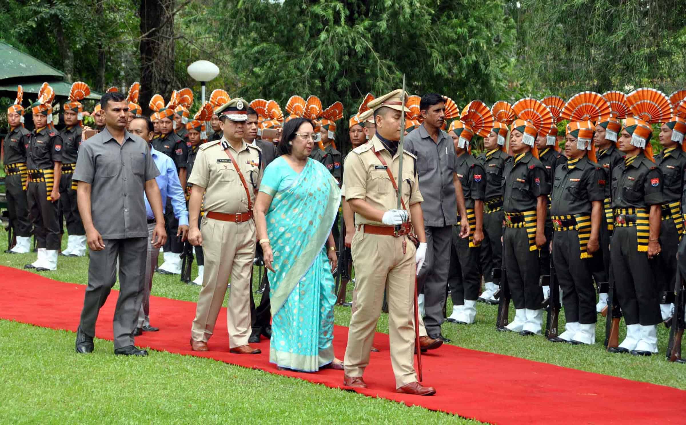 IMPHAL, AUG 21 (UNI):-Newly appointed Governor of Manipur, Najma A Heptulla, inspecting a guard of honour in Imphal on Sunday. UNI PHOTO-37U