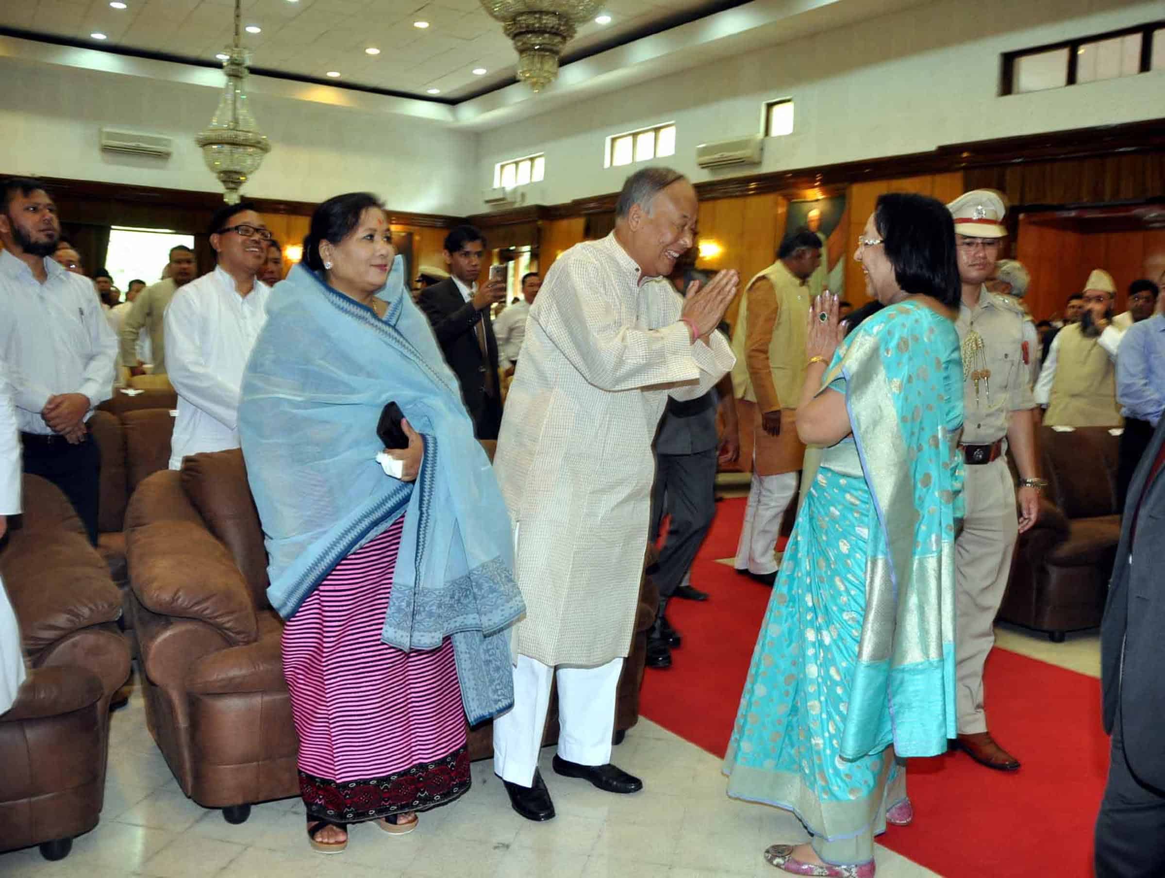 IMPHAL, AUG 21 (UNI):- Newly appointed Manipur Governor Najma A Heptulla (R), with Manipur Chief Minister Okram Ibobi Singh and his wife Okram Landhoni Devi, after appointed Governor of Manipur in Imphal on Sunday. UNI PHOTO-38U
