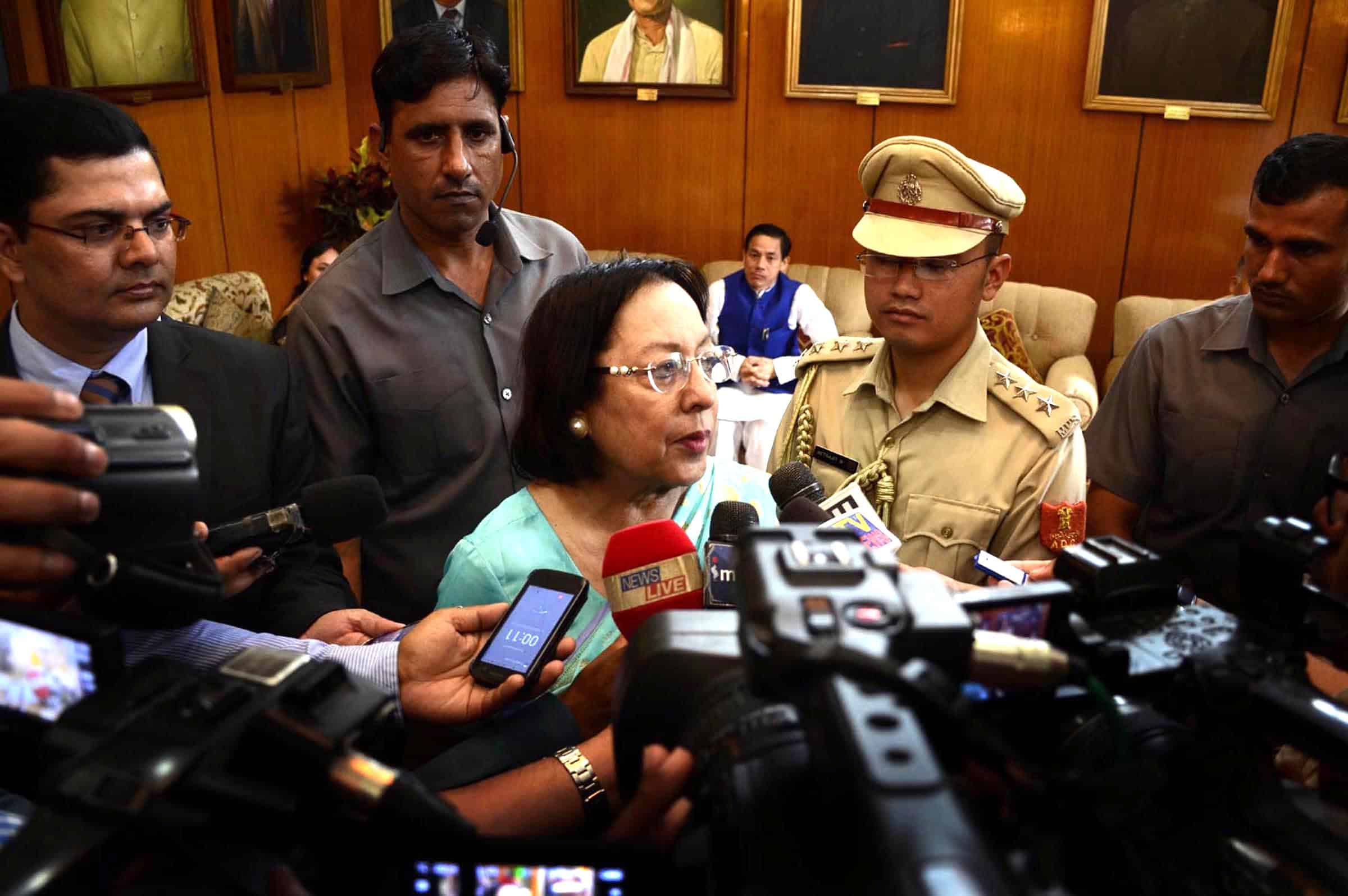 IMPHAL, AUG 21 (UNI):-Newly appointed Manipur Governor Najma A Heptulla speaking to media after sworn as 18th Manipur Governor,at Raj Bhavan Darbar Hall in Imphal on Sunday. UNI PHOTO-39U