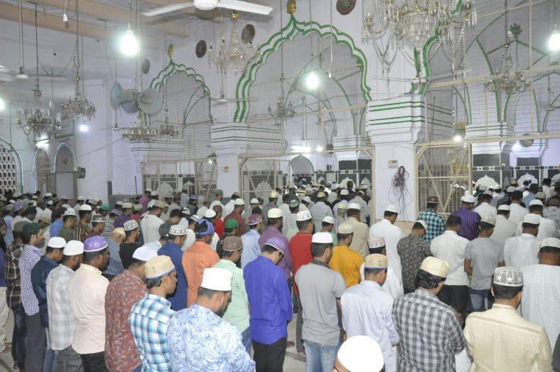 Mussallies offering Taraweeh prayers at Jama Masjid Chowk as the Holy month of Ramadan begins in Hyderabad on Thursday. (Pics. Mazher)