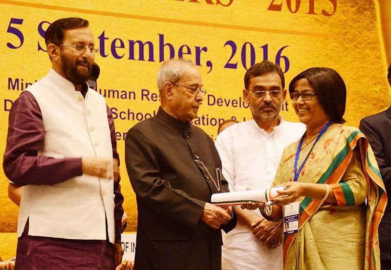 NEW DELHI, SEP 5 (UNI):- President Pranab Mukherjee presenting the National Award for Teachers-2015 to Geetaben Nayankumar Waghela(Gujarat), on the occasion of the ‘Teachers Day’ in New Delhi on Monday. UNI PHOTO-60U