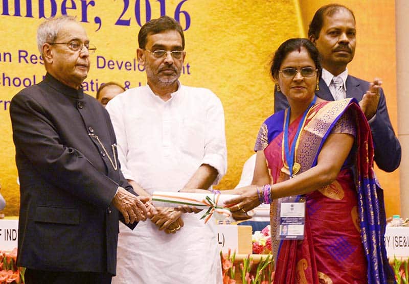 NEW DELHI, SEP 5 (UNI):- President Pranab Mukherjee presenting the National Award for Teachers-2015 to Shakeela C B (Kerala), on the occasion of the ‘Teachers Day’ in New Delhi on Monday. UNI PHOTO-88U