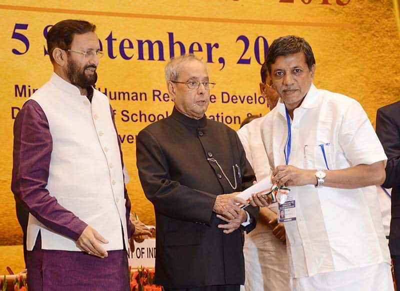 NEW DELHI, SEP 5 (UNI):- President Pranab Mukherjee presenting the National Award for Teachers-2015 to Abdul Musawwir (Odisha), on the occasion of the ‘Teachers Day’ in New Delhi on Monday. UNI PHOTO-93U