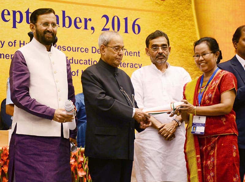 NEW DELHI, SEP 5 (UNI):- President Pranab Mukherjee presenting the National Award for Teachers-2015 to Audrey r Marak (Meghalaya), on the occasion of the ‘Teachers Day’ in New Delhi on Monday. UNI PHOTO-97U