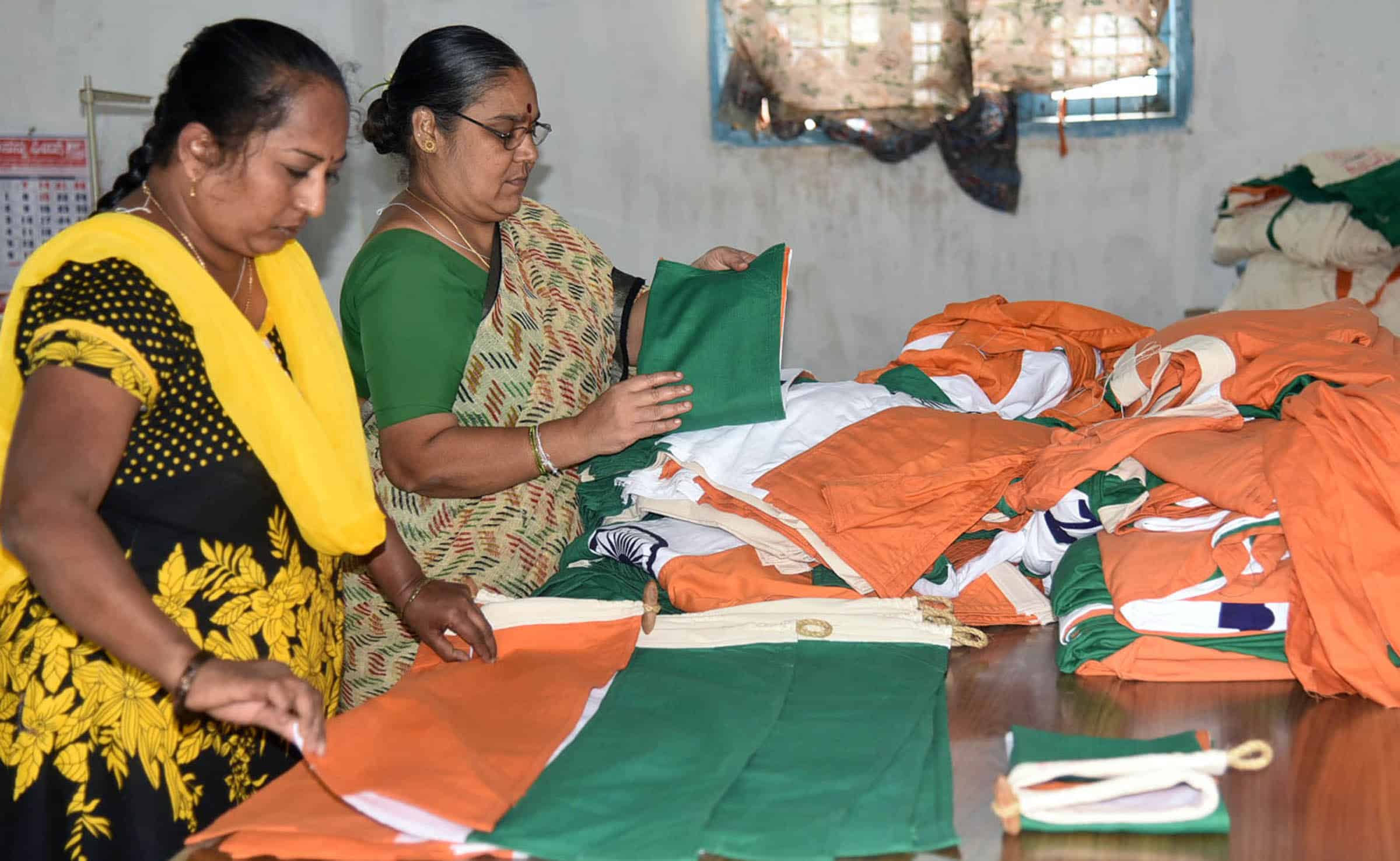 HUBBALLI, AUG 12 (UNI):- Workers of Karnataka Khadi and Gramodyog Samyukta Sanga (KKGSS) making ‘National Flags, at Bengeri in Hubballi on Friday. UNI PHOTO-17U