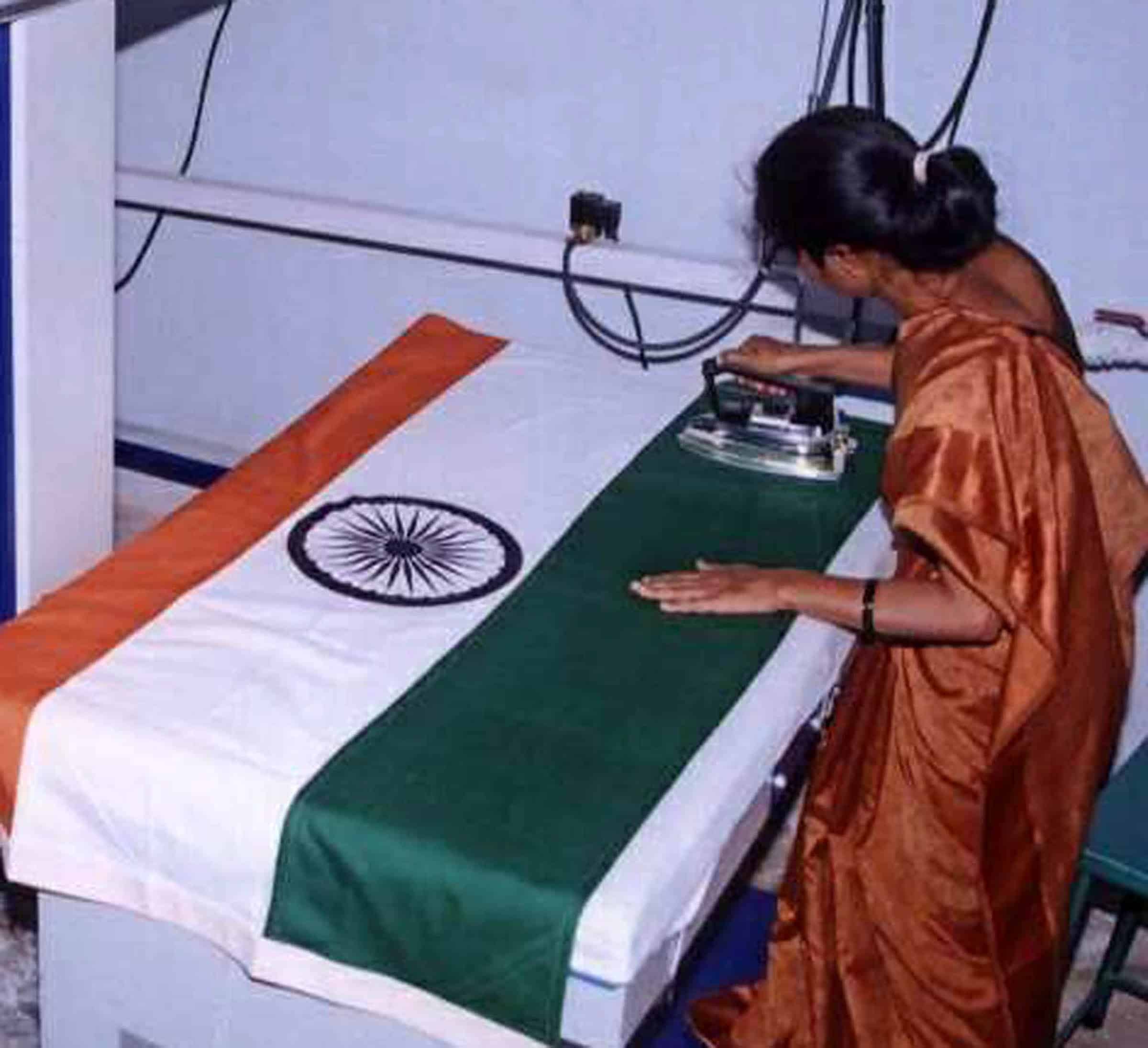 Workers of Karnataka Khadi and Gramodyog Samyukta Sanga (KKGSS) making ‘National Flags, at Bengeri in Hubballi on Friday. UNI PHOTO