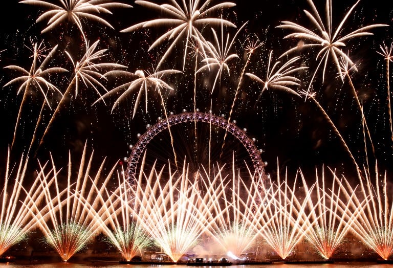 Fireworks explode around the London Eye during New Year’s celebrations in central London just after midnight on January 1, 2019. (Photo by ADRIAN DENNIS / AFP)