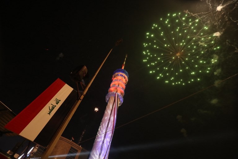 Fireworks burst above the Baghdad Tower in the Iraqi capital Baghdad on January 1, 2019 as Iraqis welcome the New Year when the tower was also opened again after its closure in 2003 during entry of US forces to Baghdad. (Photo by AHMAD AL-RUBAYE / AFP)