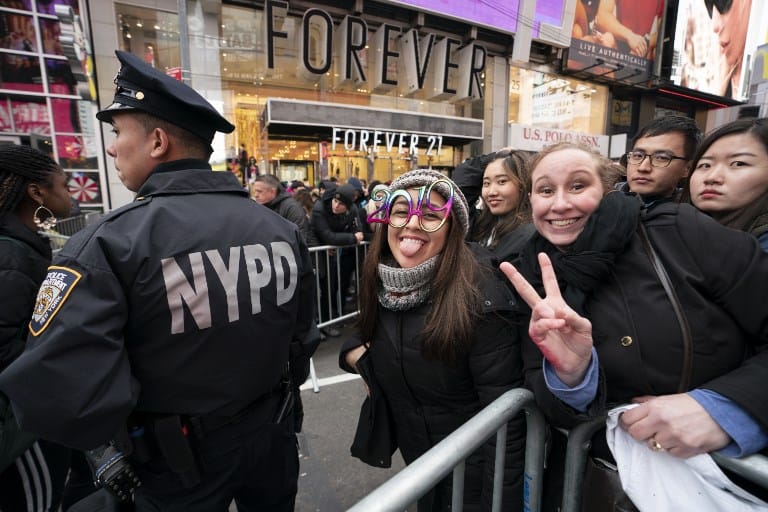 Revelers smile as they gather, with police standing by, for the New Year’s celebration December 31, 2018 in Times Square in New York. (Photo by Don EMMERT / AFP)