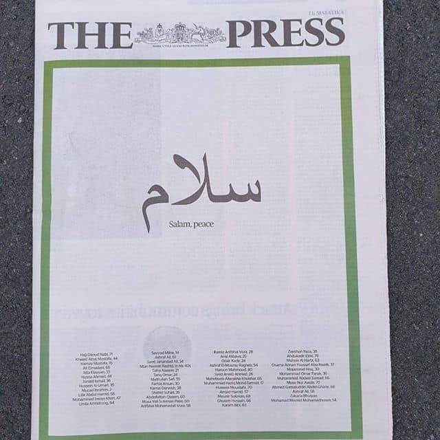 There was so much love and support from all the New Zealanders towards the Muslim community. New Zealand’s local newspaper has also published the Arabic word سلام (Peace) on its front page and mentioned the names of Martyrs who died in the Christchurch attack on Friday.