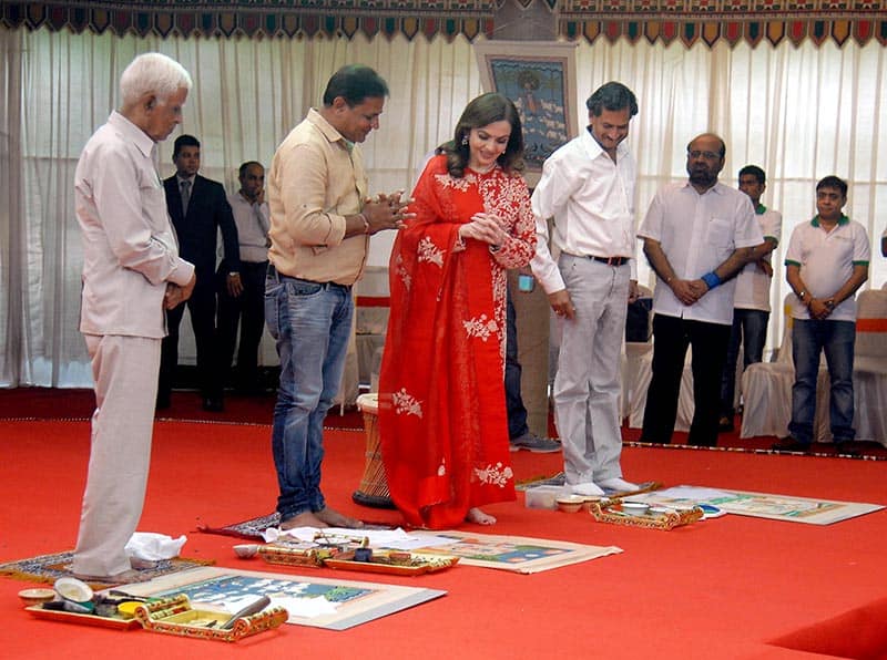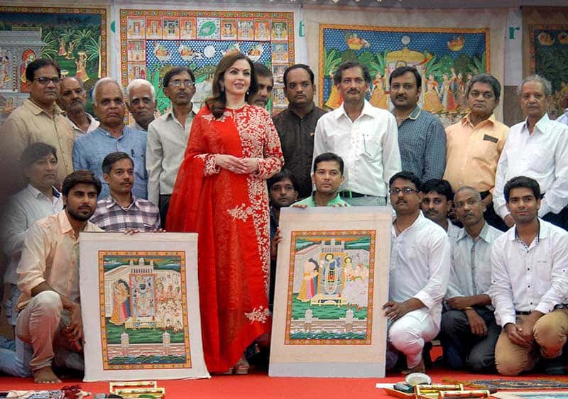 Nita Ambani, Founder and Chairperson of Reliance Foundation, looking Pichwai painting in Ahmedabad on Wednesday. Nita Ambani also announced that Pichwai painting will soon adorn the walls of RIL Headquarters and other offices, hospitals and a convention centres. UNI PHOTO