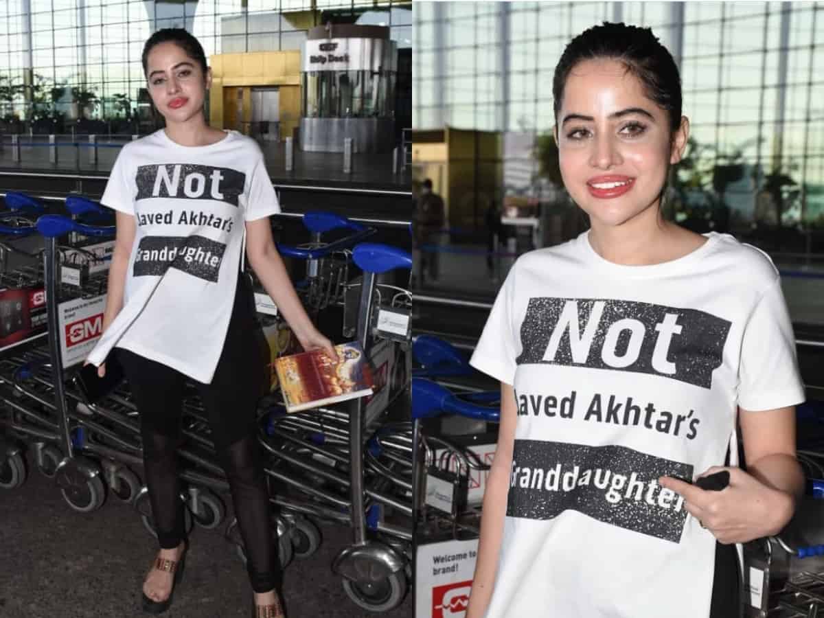 Urfi Javed is back in news again, this time for not wearing a bold dress, but for making a statement through her outfit. The actress was spotted by the paparazzi at Mumbai airport on Monday. She was seen wearing a white coloured T-shirt which had ‘Not Javed Akhtar’s Granddaughter’ printed on it.