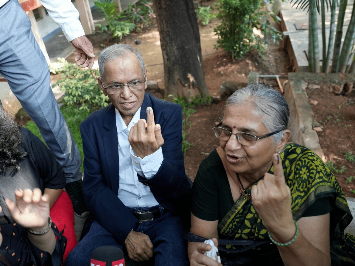 Her 76-year-old husband and Infosys co-founder Narayan Murthy voted at the BES Evening College of Arts & Commerce at Jayanagar, Bengaluru on Wednesday.