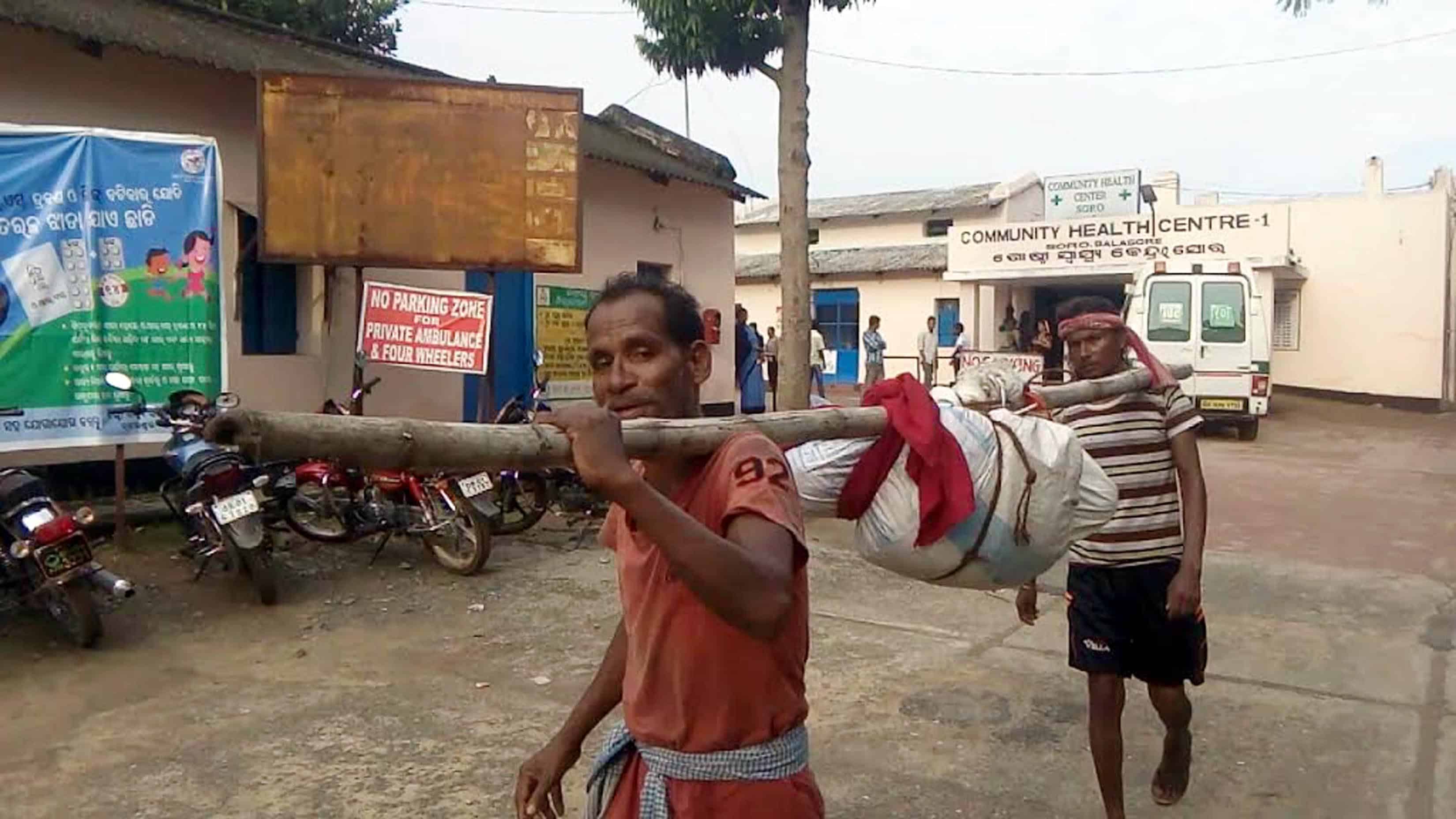 BALASORE, AUG 26 (UNI):- The body of a woman, who died after she was run over by a goods train while she was crossing the railway track, is being carried by 2 workers from Soro Community Health Centre to Soro railway station on Wednesday last. UNI PHOTO-123U
