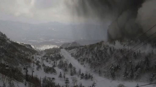 This handout image taken from the Kusatsu Mt. Shirane Gondola Unjo Camera and released by the Kusatsu Town Office on January 23, 2018 shows thick black smoke sliding down the snow-covered side of the volcano towards a ski slope after an eruption.
