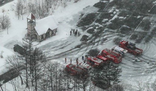 This picture shows an aerial view of ambulances and fire vehicles parked at a ski resort in the town of Kusatsu, Gunma prefecture on January 23, 2018 after a volcano erupted earlier in the day. AFP
