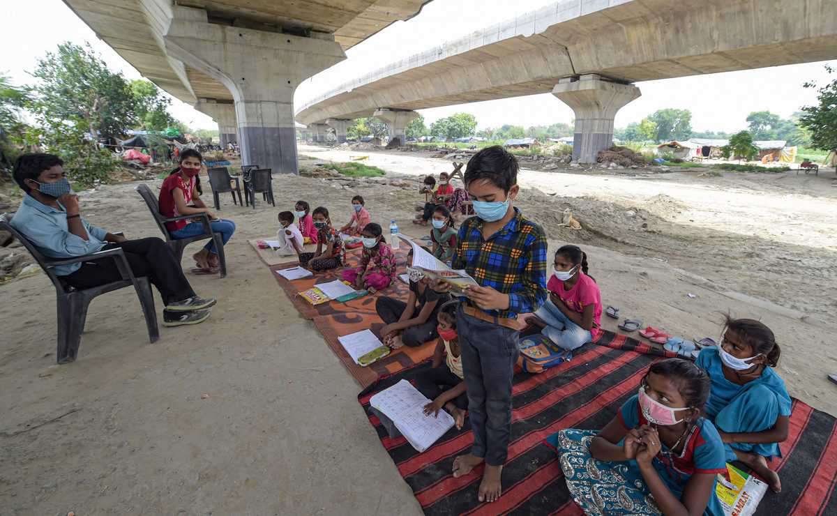 New Delhi: Students from a slum area attend an open-air tuition class at Panchsheel Shikshan Sansthan, at Yamuna Khadar Mayur Vihar, in New Delhi, June 10, 2021. (PTI Photo/Manvender Vashist)