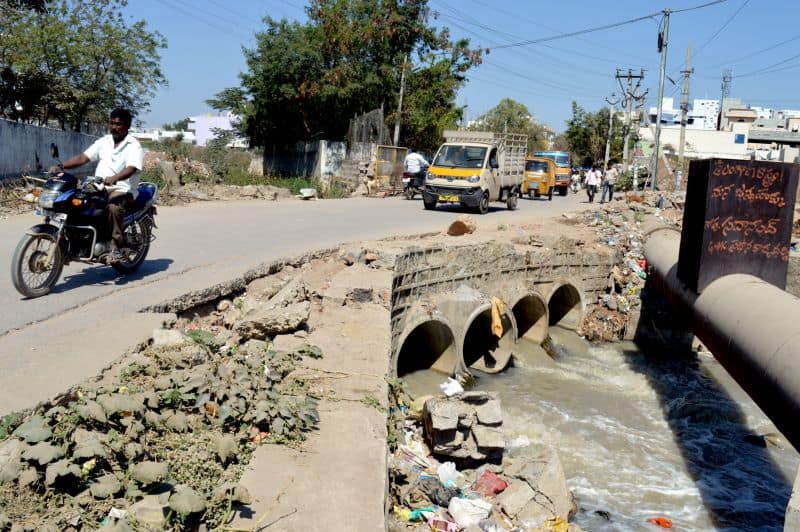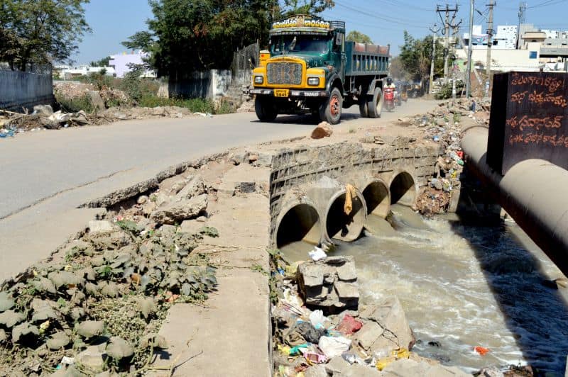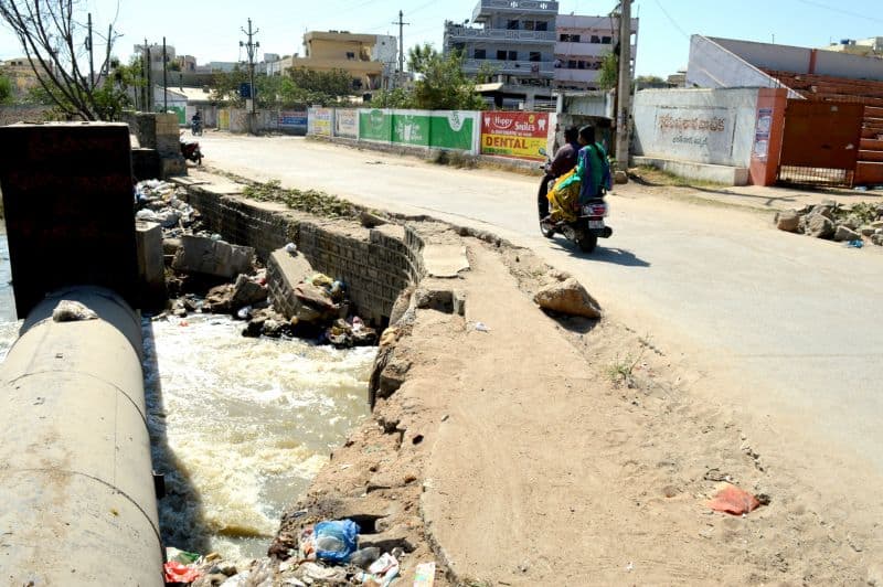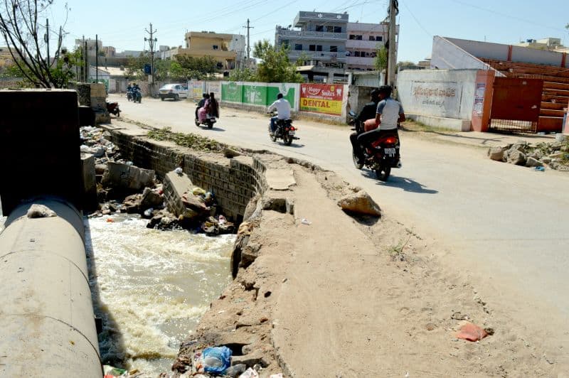 An open drain poses threats to the life of not only the pedestrians but also the motorists of chilka nagar in uppal (Photo: Murli)