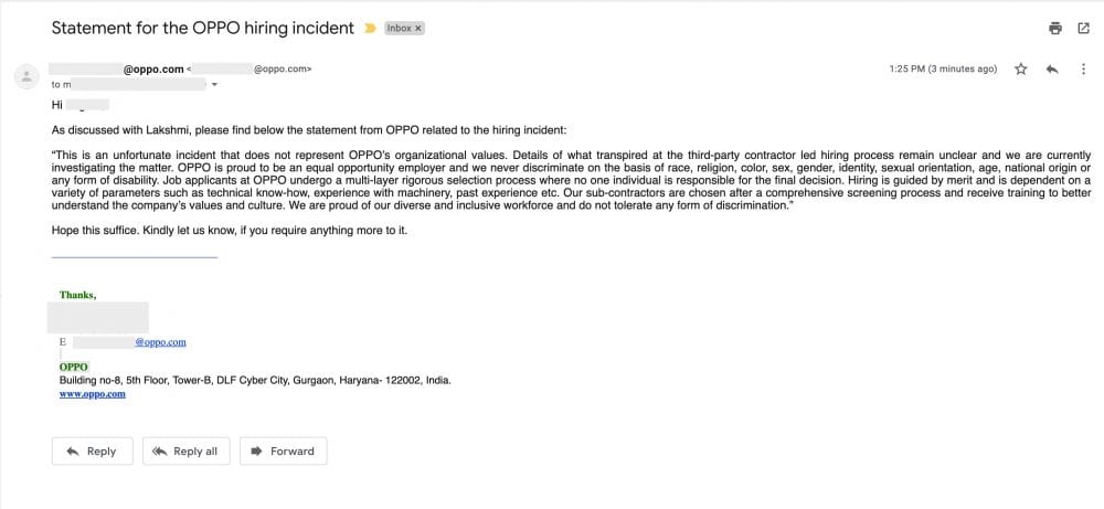 “This is an unfortunate incident that does not represent OPPO’s organizational values. Details of what transpired at the third-party contractor led hiring process remain unclear and we are currently investigating the matter. OPPO is proud to be an equal opportunity employer and we never discriminate on the basis of race, religion, color, sex, gender, identity, sexual orientation, age, national origin or any form of disability. Job applicants at OPPO undergo a multi-layer rigorous selection process where no one individual is responsible for the final decision. Hiring is guided by merit and is dependent on a variety of parameters such as technical know-how, experience with machinery, past experience etc. Our sub-contractors are chosen after a comprehensive screening process and receive training to better understand the company’s values and culture. We are proud of our diverse and inclusive workforce and do not tolerate any form of discrimination,” said the company via an e-mail.