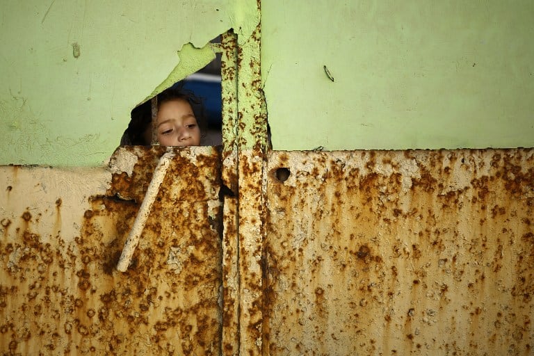 A Palestinian girl looks out of the window of her house at the Al-Shatee refugee camp in Gaza City, on August 29, 2016. / AFP PHOTO / MOHAMMED ABED