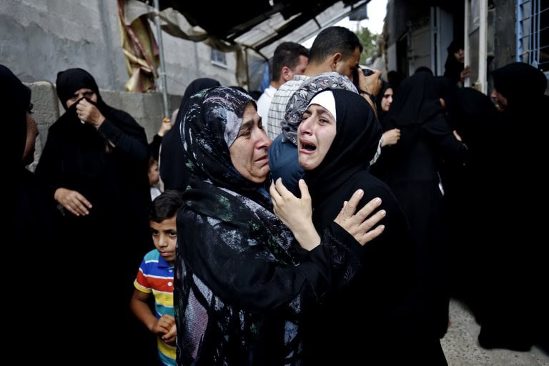 Palestinian relatives mourn over the death of 17-year-old Palestinian boy Belal Khafaja, killed the day before by Israeli forces during a protest at the Israel-Gaza border, during his funeral in Rafah in the southern Gaza Strip September 8, 2018. A Palestinian teenager was shot dead by the Israeli army during renewed clashes on the Gaza border on September 7, the health ministry in the Hamas-run strip said. Bilal Khafaja, 17, was shot in the chest during clashes east of Rafah in southern Gaza, the ministry said in a statement.