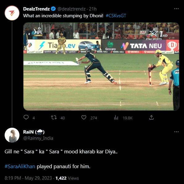 However, the focus quickly shifted from the movie to Sara’s presence, as some attributed Shubman Gill’s dismissal by MS Dhoni’s stumping to her, which supposedly led to the Gujarat Titans’ loss.