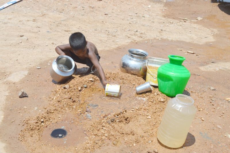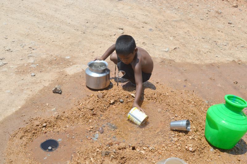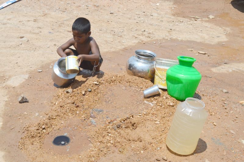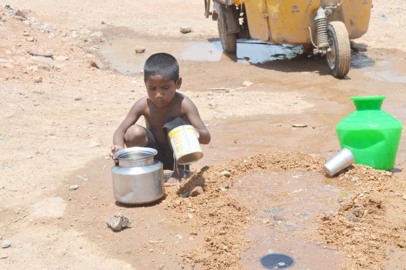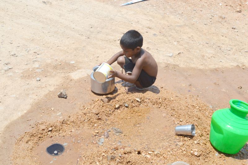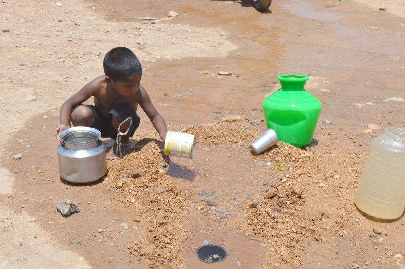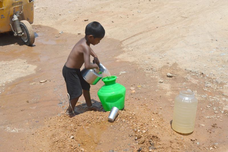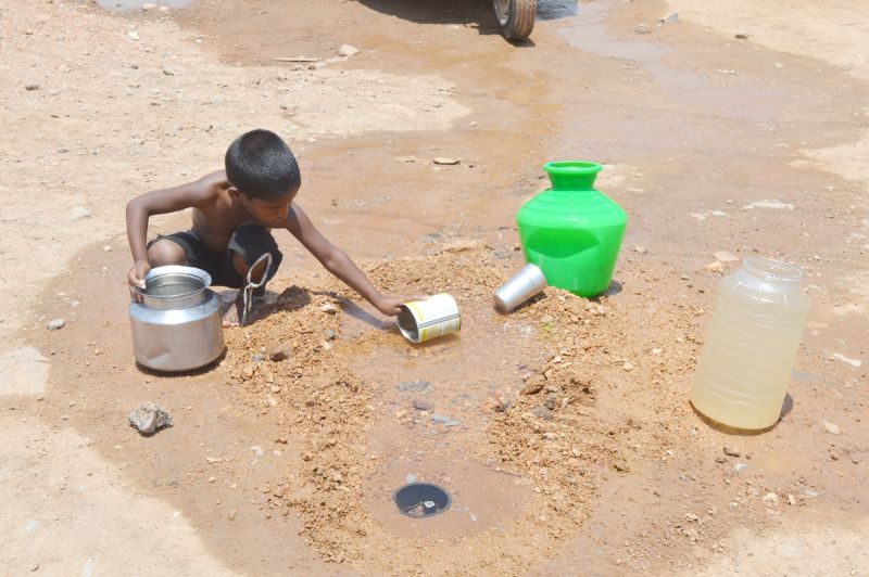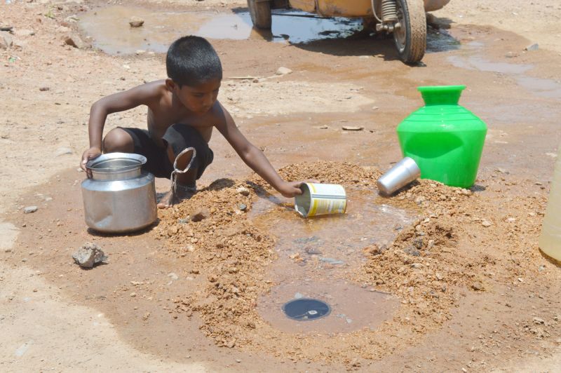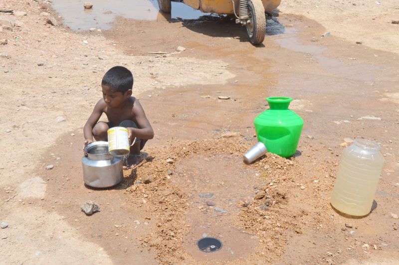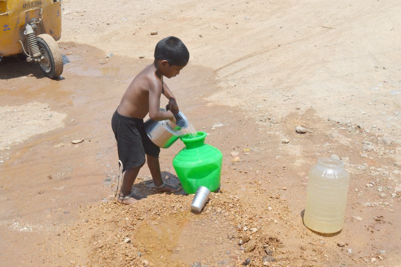 A Child is seen in Uppal filling his pot from a running water drain during a hot Summer day. (Photo: Murli)