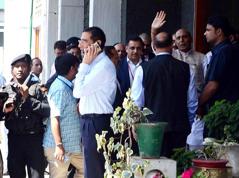 Union Home Minister Rajnath Singh waving hand while arriving at SKICC in Srinagar on Sunday, as the party of the All Party Delegation to hold talks with leaders of different political parties and other organizations besides individuals during their two day stay in the Jammu and Kashmir. UNI PHOTO