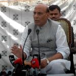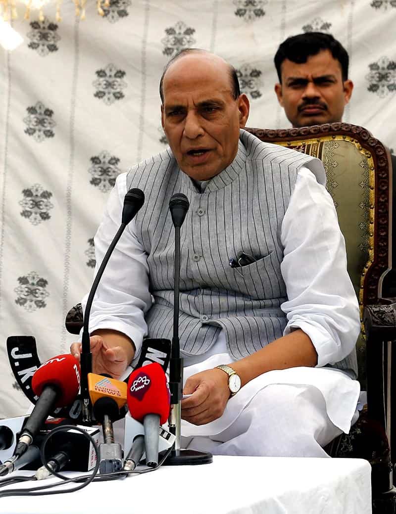 Union Home Minister Rajnath Singh who head a Parliamentarian delegation to Kashmir arriving to address a press conference in Srinagar on Monday. UNI PHOTO