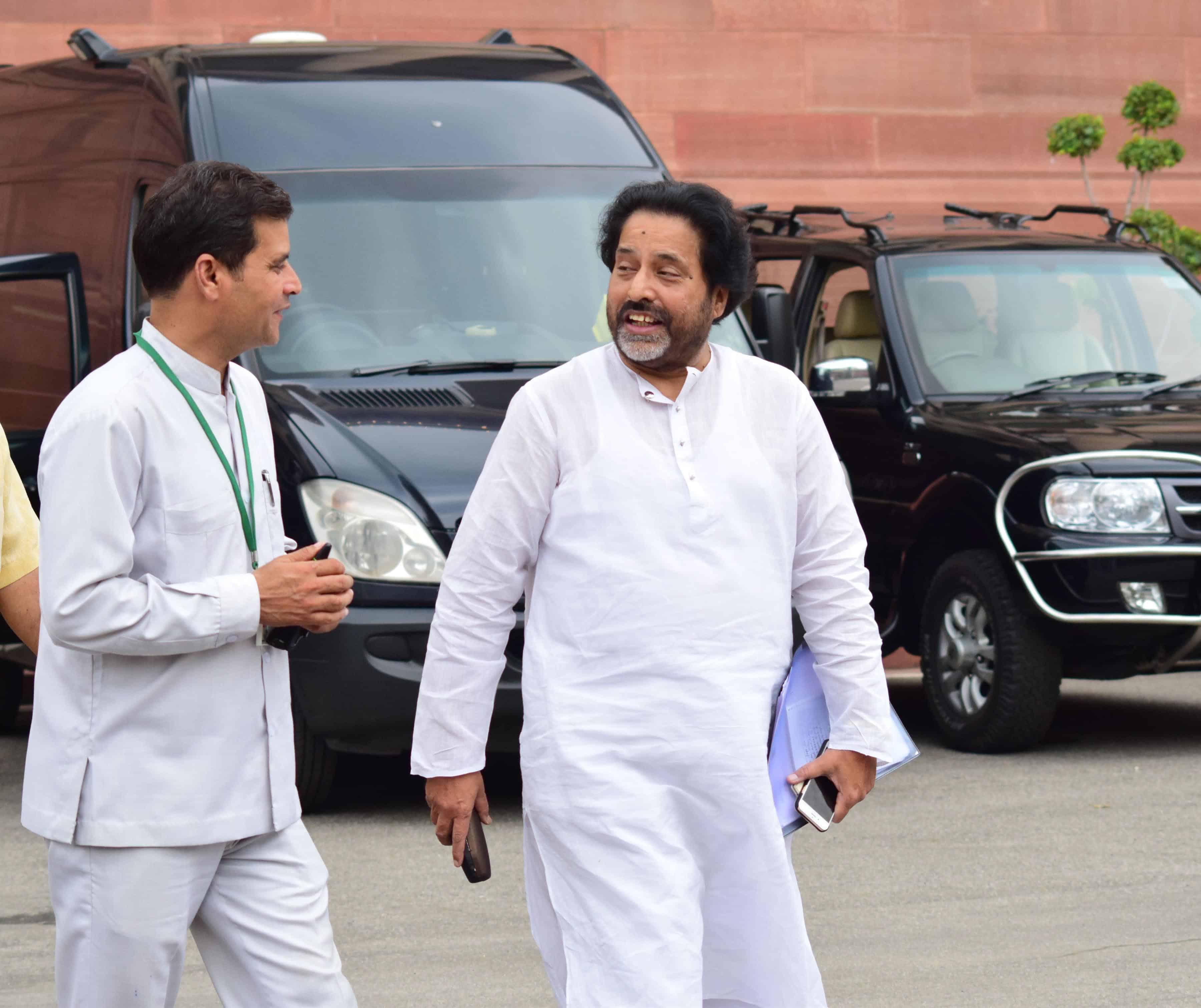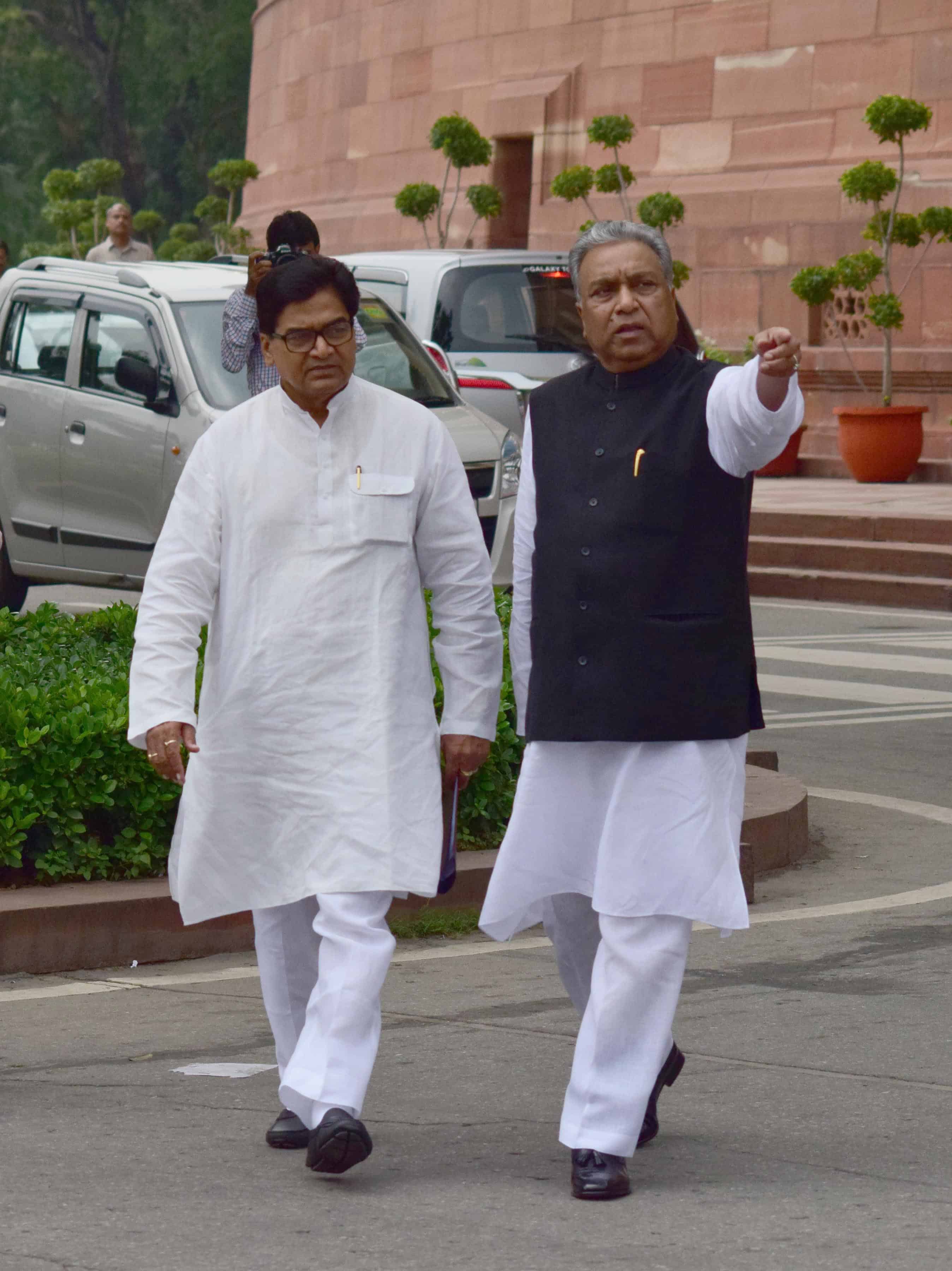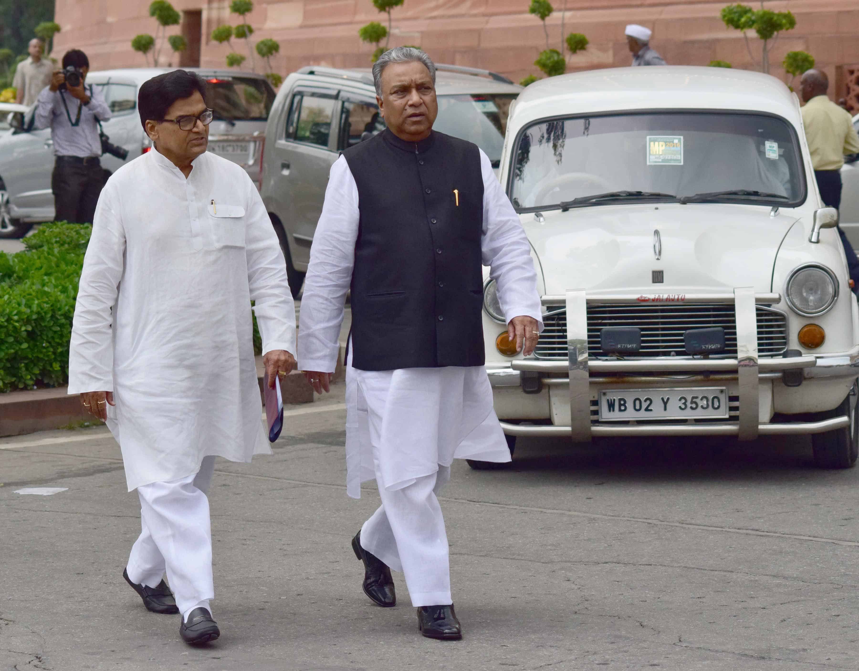 NEW DELHI, AUG 12 (UNI):-Samajwadi Party leader Ram Gopal Yadav and RJD leader Prem Chand Gupta on their way to attend the All Party meeting convened by Prime Minister Narendra Modi on Kashmir issue in New Delhi on Friday. UNI PHOTO-78u