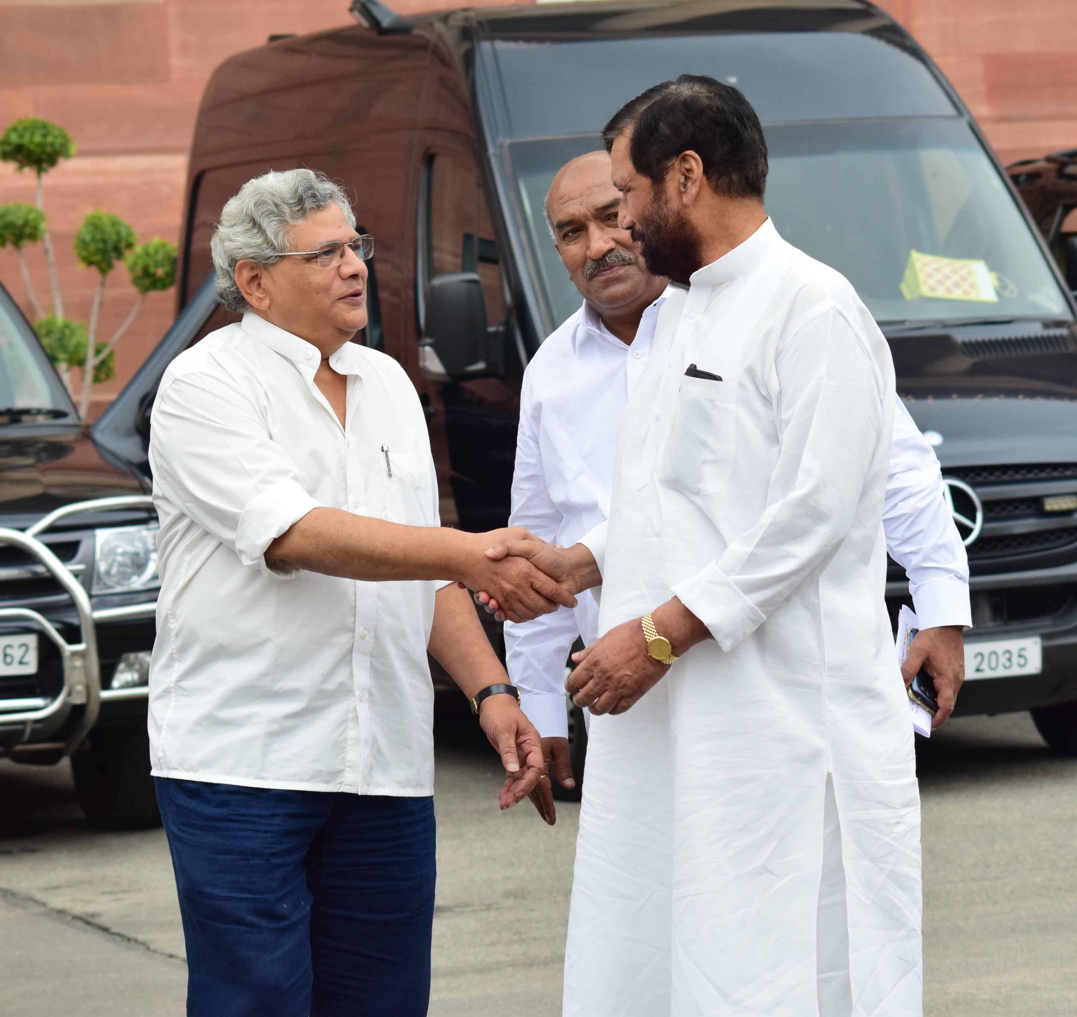 NEW DELHI, AUG 12 (UNI):-CPI(M) General Secretary Sitaram Yechury and Lok Janshakti Party supremo Ram Vilas Paswan on their way to attend the All Party meeting convened by Prime Minister Narendra Modi on Kashmir issue in New Delhi on Friday. UNI PHOTO-85u