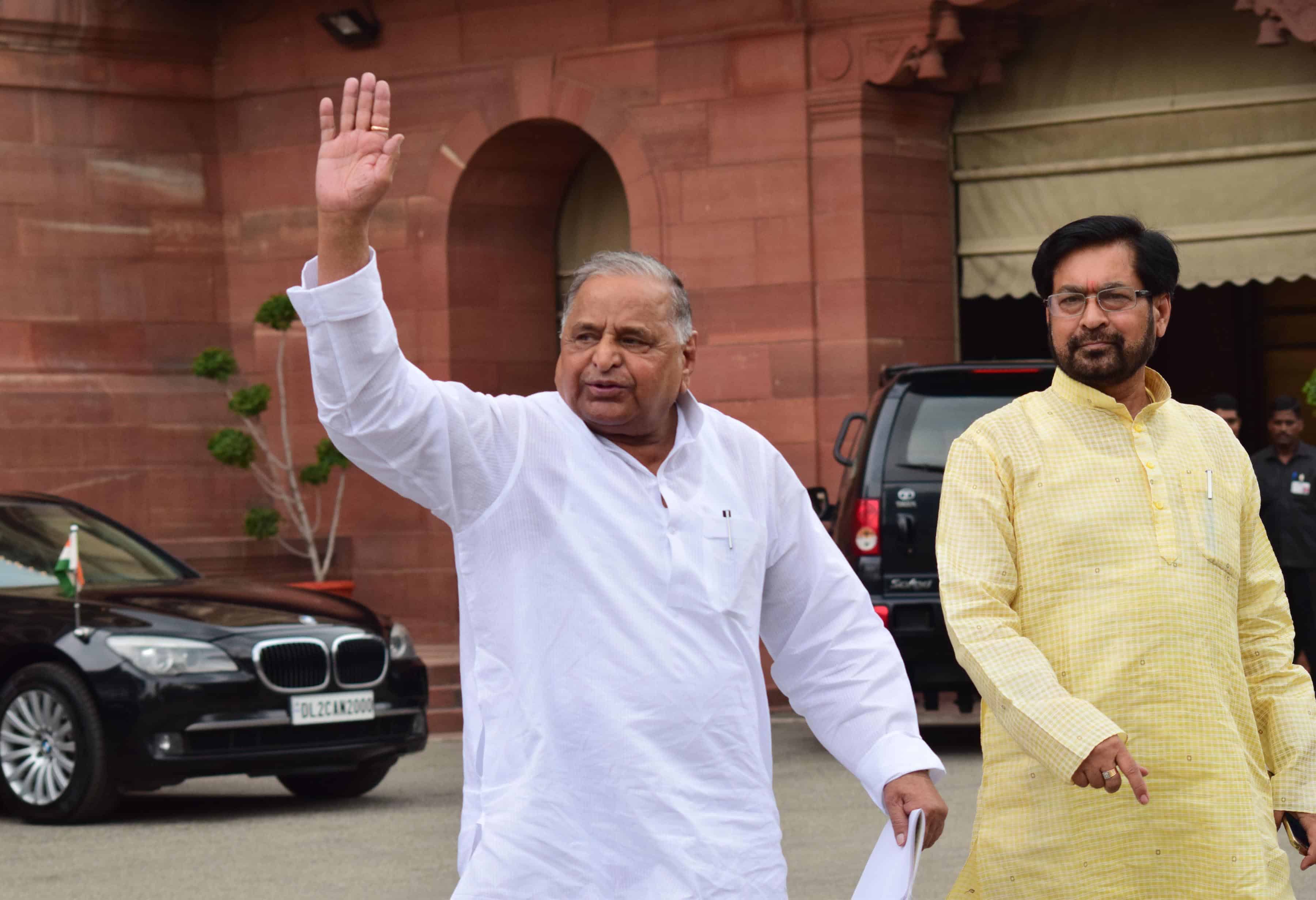 NEW DELHI, AUG 12 (UNI):-Samajwadi Party supremo Mulayam Singh Yadav on his way to attend the All Party meeting convened by Prime Minister Narendra Modi on Kashmir issue in New Delhi on Friday. UNI PHOTO-91u