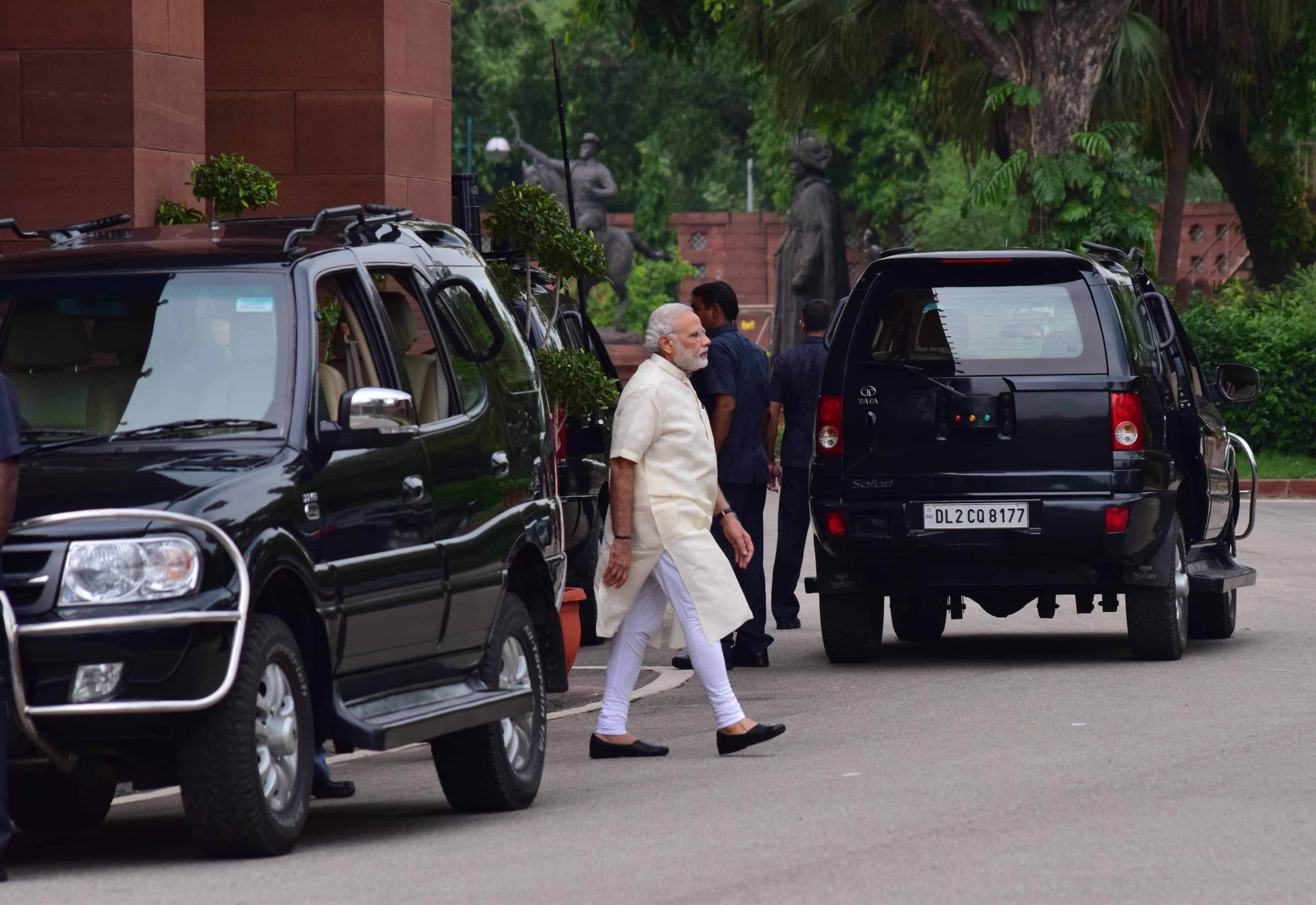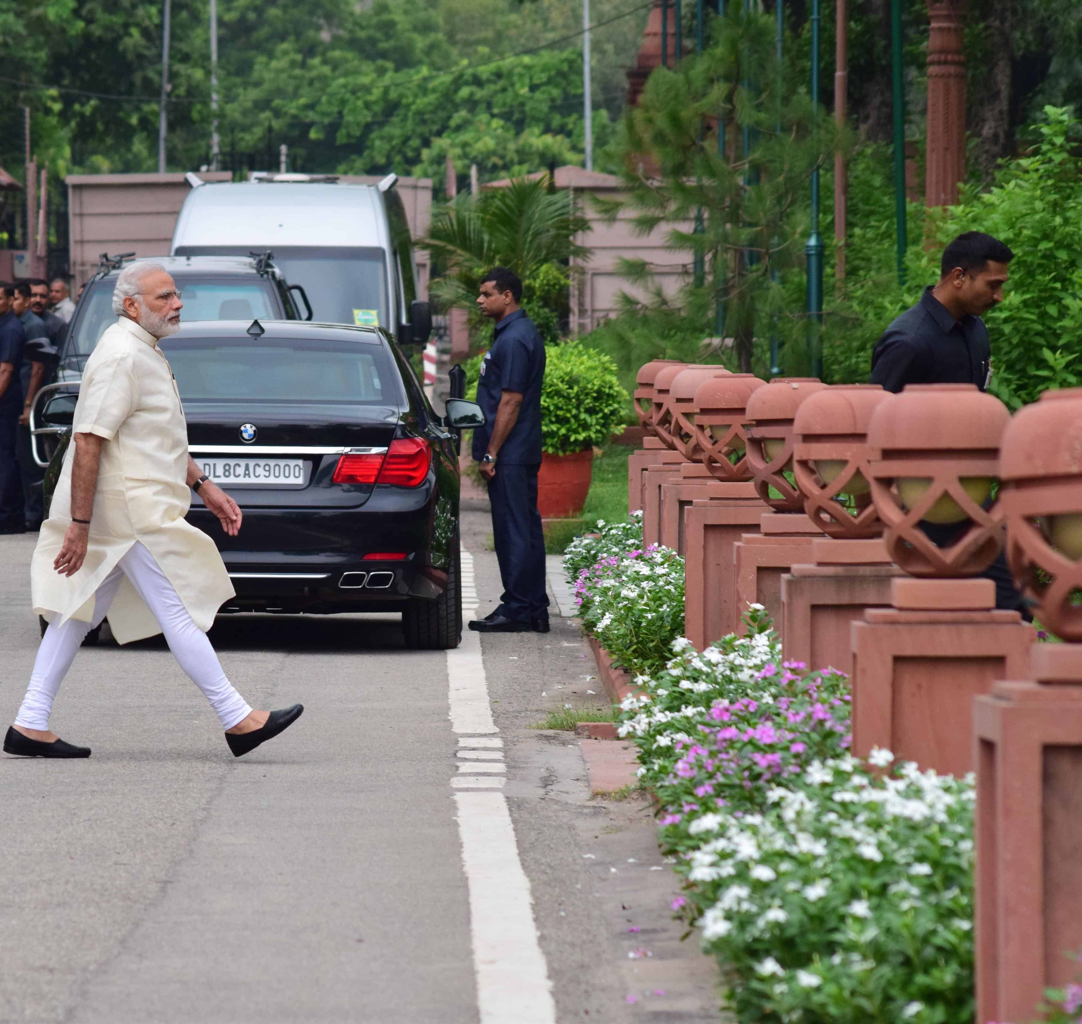 NEW DELHI, AUG 12 (UNI):-Prime Minister Narendra Modi on his way to attend the All Party meeting convened by him on Kashmir issue in New Delhi on Friday. UNI PHOTO-93u
