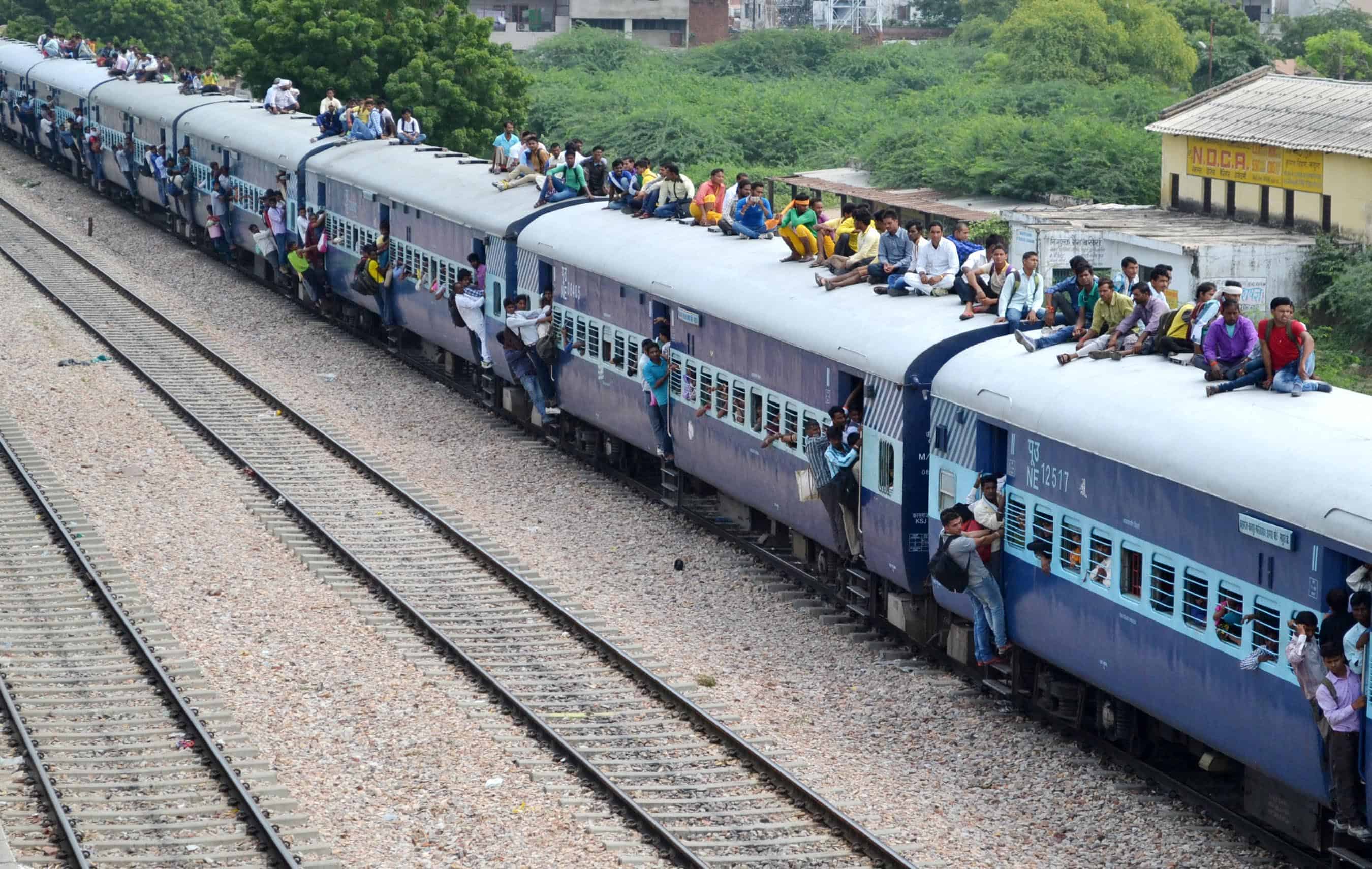 Passengers traveling on rooftop of a train to participate in Sri Krishna Janamshtami festival in Mathura on Tuesday. UNI PHOTO