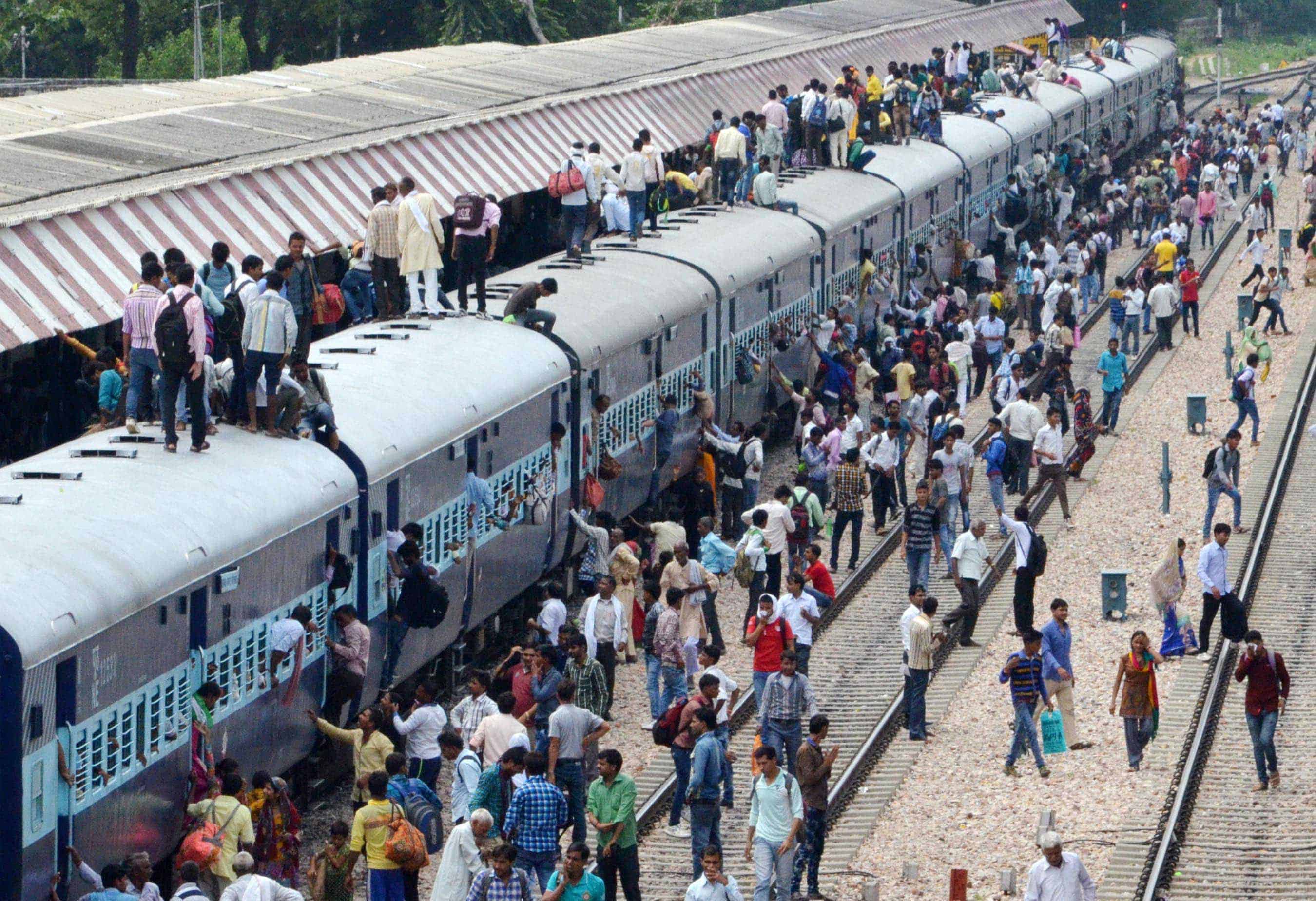 MATHURA, AUG 23 (UNI):- Passengers travelling on rooftop of a train to participate in Sri Krishna Janamshtami festival in Mathura on Tuesday. UNI PHOTO – 116U