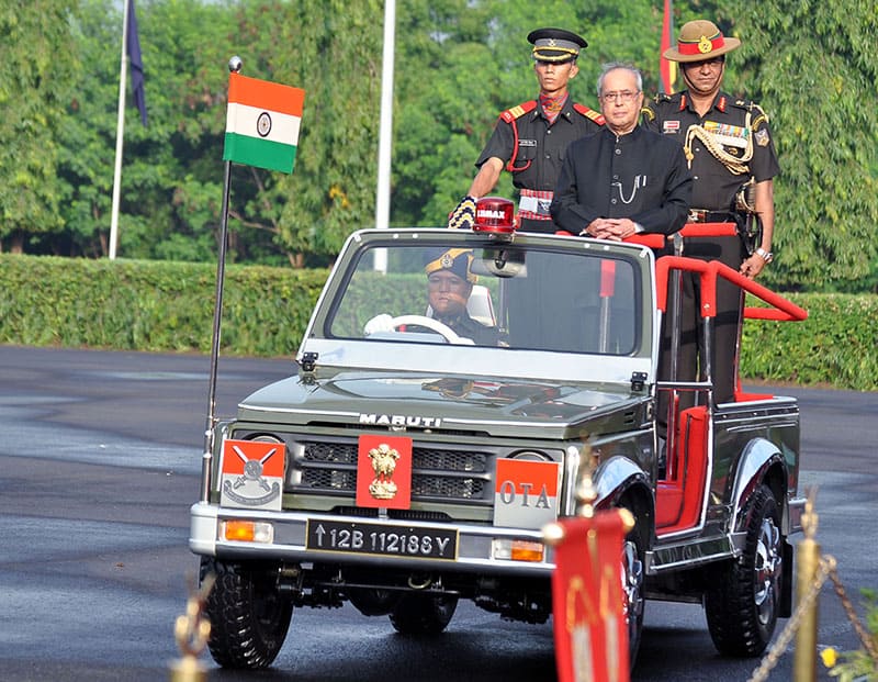 CHENNAI, SEP 10 (UNI):- President Pranab Mukherjee reviewing the Passing Out Parade at Officers Training Academy (OTA), in Chennai on Saturday. UNI PHOTO-54U