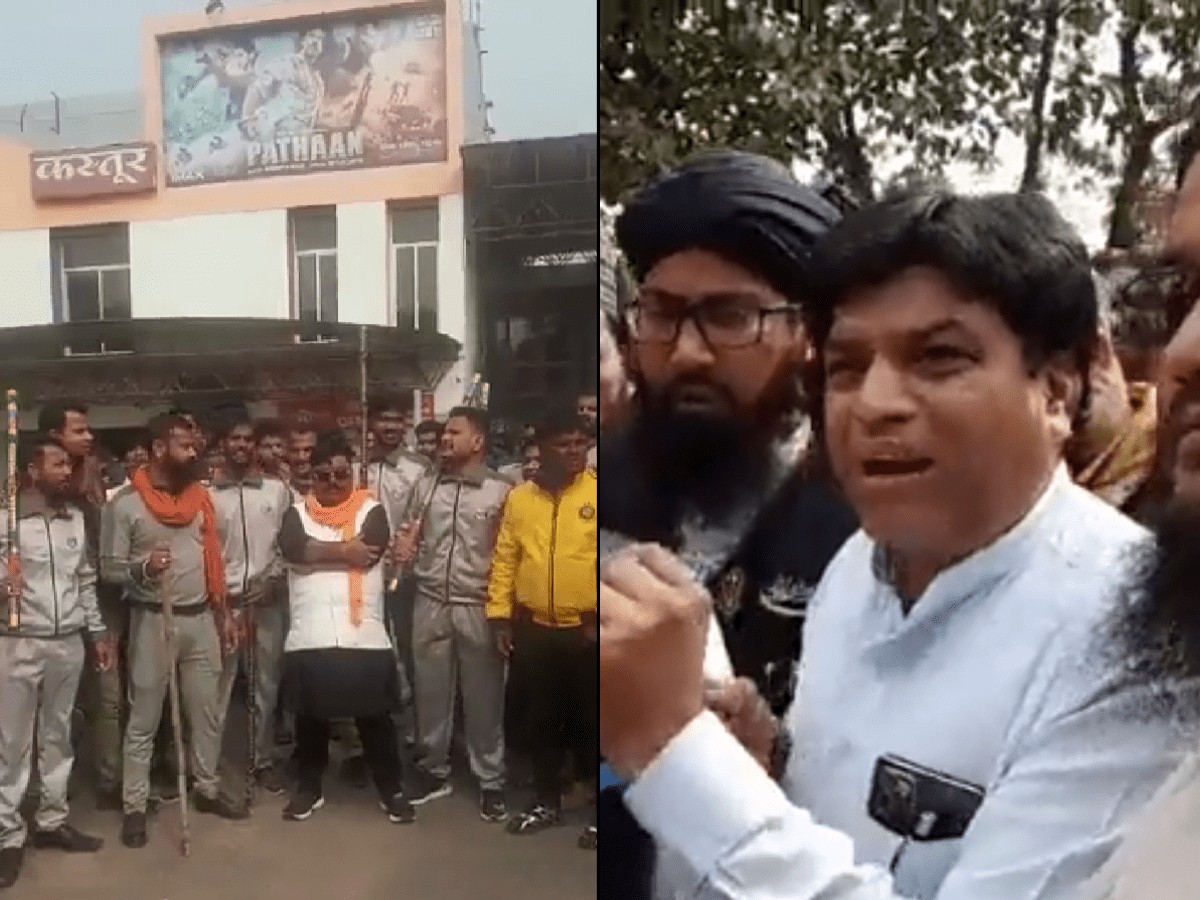 In Madhya Pradesh’s Indore, members of a Hindutva group protested in front of a theatre raising provocative slogans against Prophet Muhammed and Shah Rukh Khan’s movie ‘Pathaan’ which was released in India and worldwide on Wednesday.