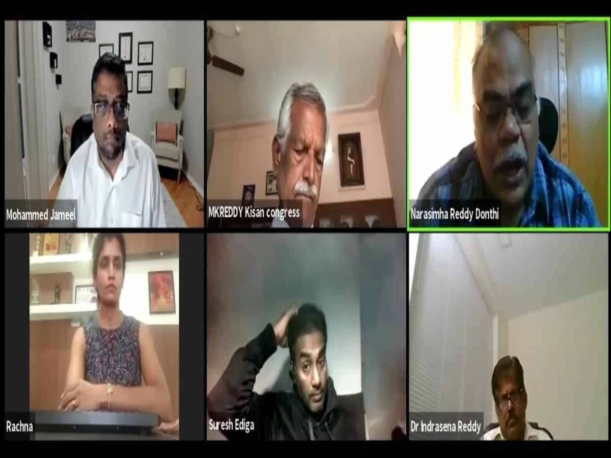 The meet was addressed by Donthi Narasimha Reddy, a public policy reviewer, M. Kodanda Reddy, Vice president, All India Kisan Congress, B. Rachana Reddy, well known lawyer, crusader against land acquisition Act and Dr Mohammed Jameel from Indian American Forums and Suresh Ediga from I4farmers.