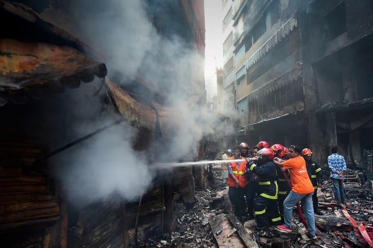 Firefighters try to extinguish a fire in Dhaka on February 21, 2019. – At least 69 people have died in a huge blaze that tore through apartment buildings also used as chemical warehouses in an old part of the Bangladeshi capital Dhaka, fire officials said on February 21. (Photo by Munir UZ ZAMAN / AFP)