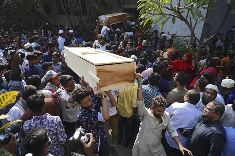 Relatives carry out coffins of fire victims from a hospital after a fire tore through apartment blocks in Bangladesh’s capital Dhaka on February 21, 2019. – At least 70 people were killed when fire tore through crumbling apartment blocks in a historic part of Dhaka, setting off a chain of explosions and a wall of flames down nearby streets, officials said on February 21. It started in one building where chemicals for deodorants and other household uses were illegally stored and spread at lightning speed to four nearby buildings, the fire service said. (Photo by MUNIR UZ ZAMAN / AFP)