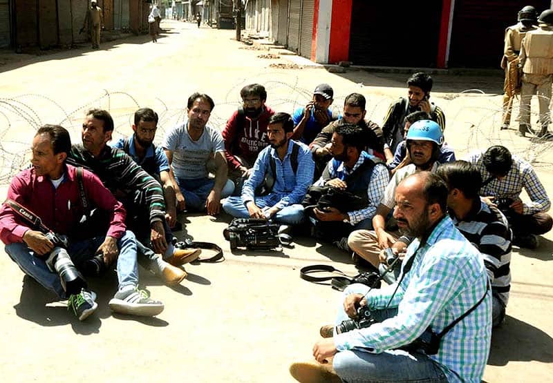 SRINAGAR, SEP 3 (UNI):- Photojournalists during protest against the beating of over a dozen Photojournalists by police at Battamalo in Srinagar on Saturday. UNI PHOTO-100U