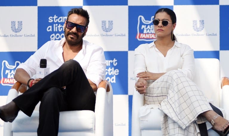 Mumbai: Indian Bollywood actors Ajay Devgn with his wife Kajol Devgn attended the launch of the environmental campaign “Start a little Good” during the “Plastic Banega Fantastic” event, in Mumbai on January 19, 2019. (AFP)