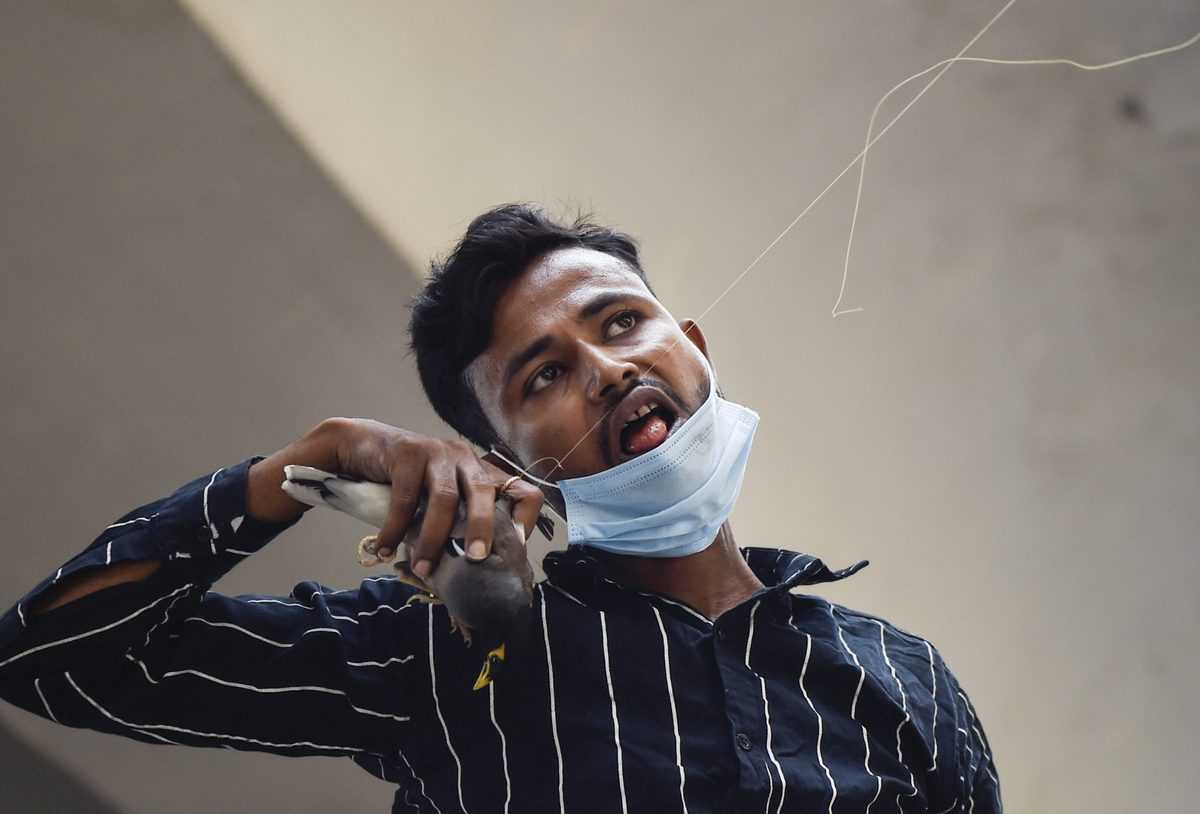New Delhi: A man rescues common myna from nylon manjha (kite-string) near the Mayur Vihar Metro Station in New Delhi, Friday, July 9, 2021. (PTI Photo/Ravi Choudhary)